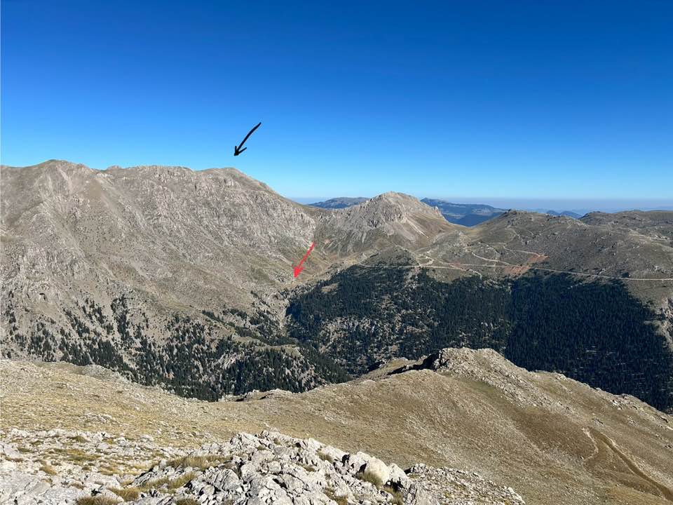 Προς τη βόρεια πλευρά, στο μαύρο βέλος η Πυραμίδα της Γκιώνας, με υψόμετρο 2.510 μ. (το πυραμιδικό σχήμα προβάλει ανατολικά προς τις Βρύζες, ενώ εδώ η κορυφή φαίνεται μόνο σαν μια μικρή προεξοχή).