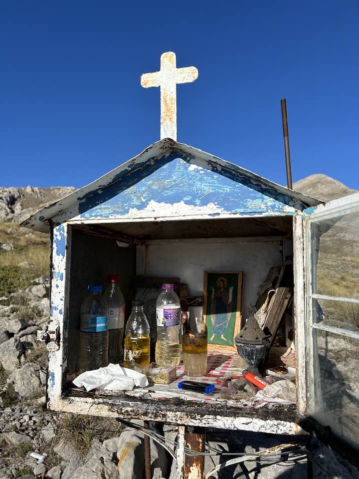 Στη στροφή που ανεβαίνει προς την κορυφή, υπάρχει ένα μικρό προσκυνητάρι, για να ανάψουν το καντηλάκι όσοι δεν θα ανέβουν μέχρι πάνω.