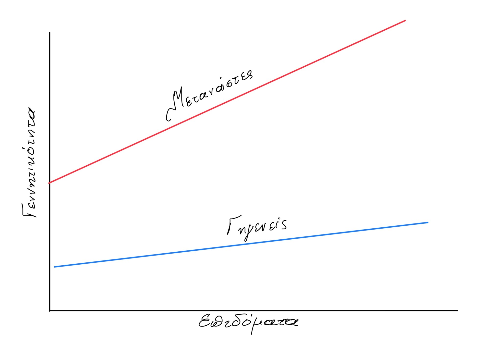Πού θα προβλέπαμε ότι θα βρίσκονταν οι ρυθμοί γεννήσεων των μεταναστών; Προσωπικά, θα περίμενα μια γραμμή που ξεκινά ήδη ψηλά στον κατακόρυφο άξονα άλλα έχει επίσης και ισχυρή ανοδική κλίση. Αντίθετα, για τους ιθαγενείς πολίτες θα περίμενα μια σχεδόν οριζόντια καμπύλη (σχετική αδιαφορία για τα επιδόματα), ταυτόχρονα με το απογοητευτικά χαμηλό σημείο εκκίνησης.