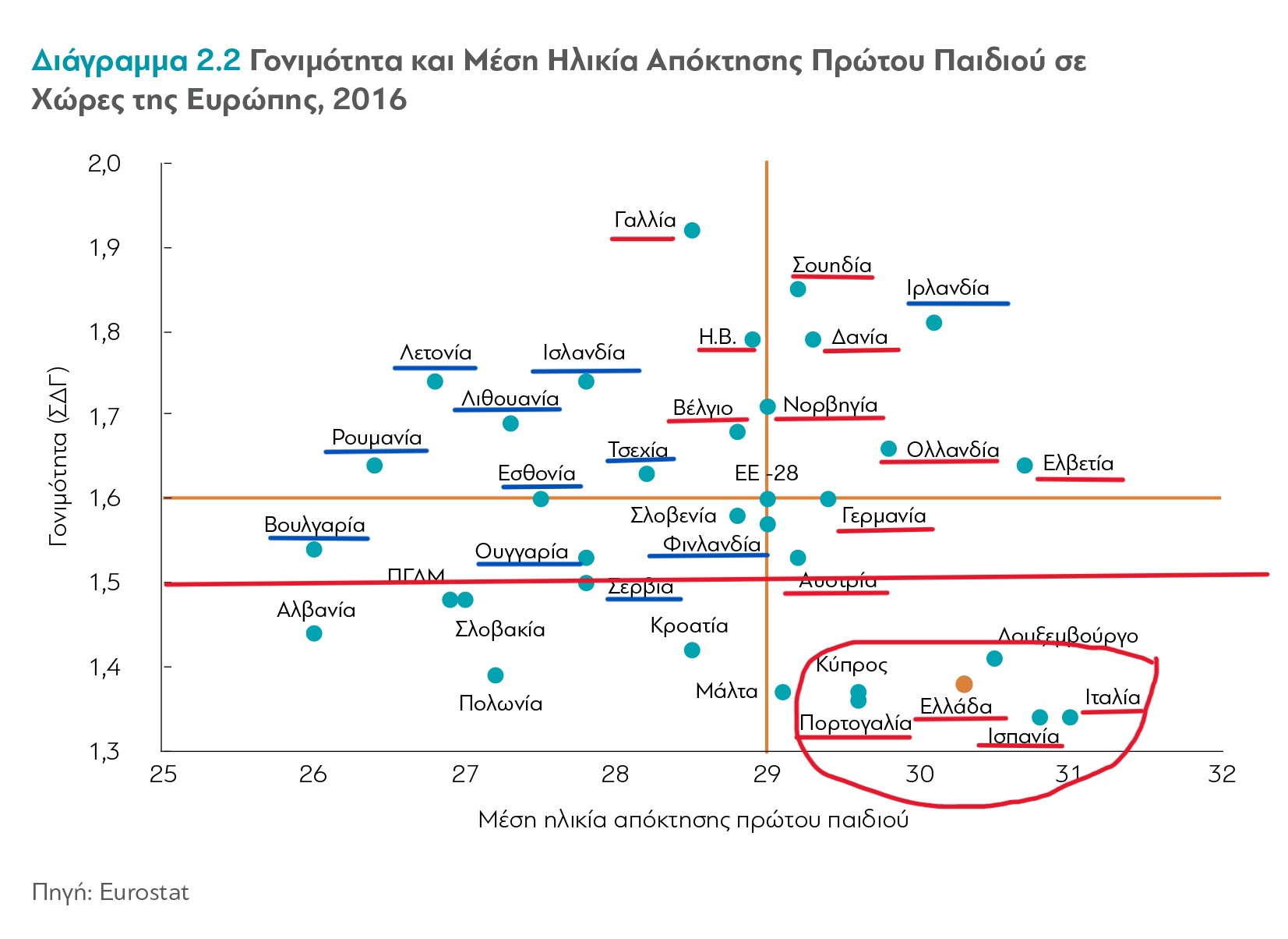 Σε αληθινά απελπιστική θέση είναι οι χώρες στο κάτω δεξί μέρος του διαγράμματος, εκεί όπου οι γυναίκες κάνουν όχι μόνο λιγότερα παιδιά αλλά τεκνοποιούν και πολύ αργά στη ζωή τους. Οι χώρες αυτές θα πρέπει να θεωρούνται καταδικασμένες σε οικονομικό μαρασμό, σε πολιτισμική αλλοίωση και, αν γειτνιάζουν και με κάποιο επίφοβο γείτονα, ακόμη και σε γεωπολιτικό αφανισμό. Μήπως διακρίνεται εκεί μια τέτοια καταδικασμένη χώρα;
