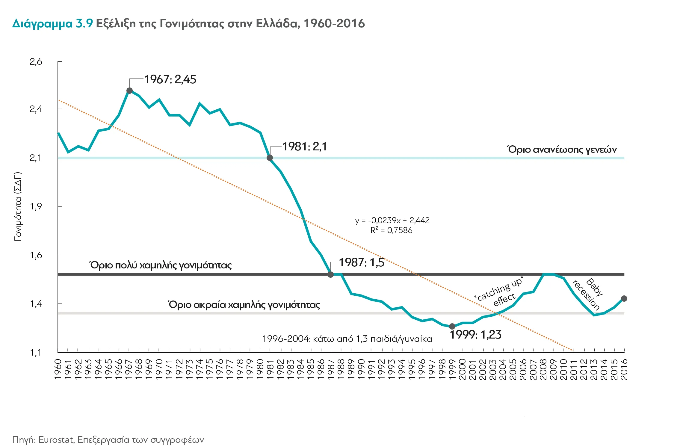 Αναζητώντας περισσότερο υλικό διάβασα και μια άλλη έρευνα (Πηγή 2), η οποία έγινε για λογαριασμό του μη κερδοσκοπικού ερευνητικού οργανισμού "διαΝΕΟσις". Την έρευνα διενέργησε μια ομάδα ερευνητών του Εθνικού Κέντρου Κοινωνικών Ερευνών (ΕΚΚΕ), με συντονιστή και επιστημονικό υπεύθυνο τον Διευθυντή Ερευνών του ΕΚΚΕ, Διονύση Μπαλούρδο. Από εκεί πήρα και το εισαγωγικό γράφημα για την εξέλιξη της υπογεννητικότητας στην Ελλάδα.