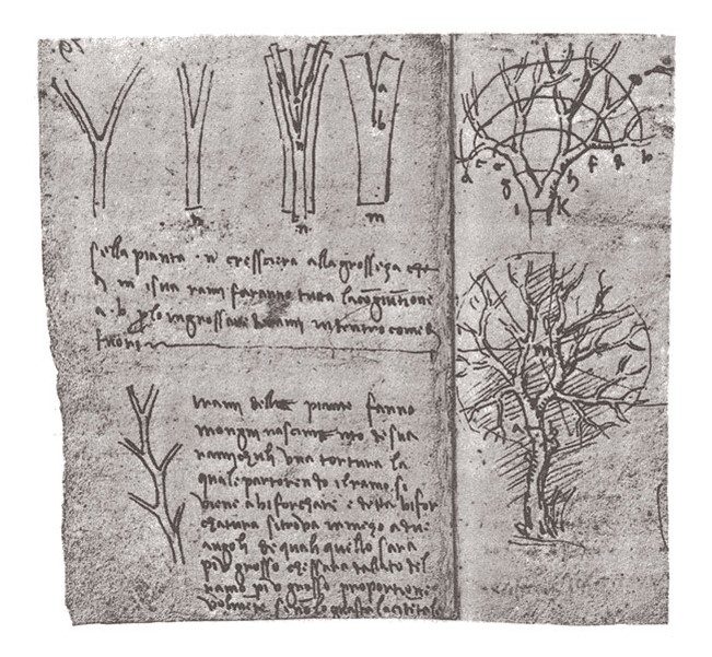 Ο Da Vinci θεώρησε ότι βρήκε τον κανόνα με βάση τον οποίο διακλαδώνονται ο κορμός και κατόπιν τα κλαδιά των δέντρων. Ο κανόνας στηρίζεται σε μια αρχή διατήρησης, η οποία για τον Da Vinci ήταν η επιφάνεια διατομής. Δηλαδή, το άθροισμα της επιφάνειας διατομής των θυγατρικών κλάδων αμέσως μετά τη διακλάδωση, είναι ίσο με τη επιφάνεια του κλάδου/κορμού γονέα. Αν λοιπόν ένα δέντρο ανοίγεται ως βεντάλια, τότε μαζεύοντας πάλι τη βεντάλια παίρνουμε έναν "σωλήνα" με ύψος όσο και αυτό του δέντρου. Ακούγεται απλό, οικονομικό (ως αρχή διατήρησης) και επίσης συμμετρικό. Γιατί να μην είναι αλήθεια;