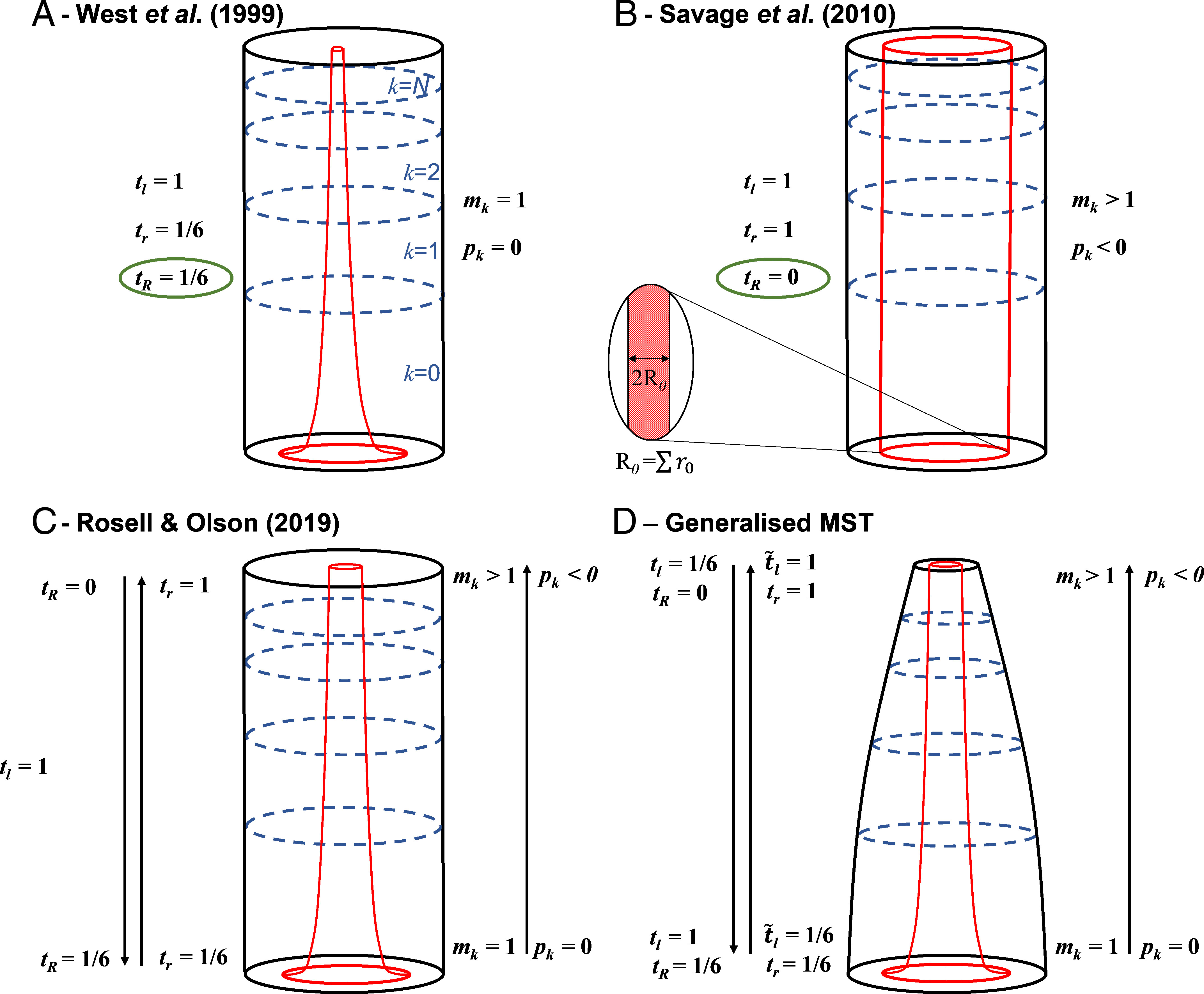 Παρ΄ ότι στη μελέτη η μαθηματικοποίηση δίνει ξεκάθαρα το αναμενόμενο αποτέλεσμα (για όποιον μπορεί να ακολουθήσει την πορίεα συλλογισμών και υπολογισμών στην Πηγή 6), θα προσπαθήσω να το πω και με τη δική μου διαίσθηση του φυσικού: καθώς ολοκληρώνει το δέντρο τη μεταφορά και προετοιμάζεται για τη διανομή, στην περιοχή που αυξάνεται απότομα το πλήθος των οδών διανομής, η μείωση της διαμέτρου των αγγείων πρέπει να γίνει πολύ γρηγορότερα, ώστε να διατηρηθεί η ταχύτητα ροής. Για να "σπρώξει" τους χυμούς με επαρκή ροή πρέπει να μικρύνει πολύ πιο γρήγορα τη διατομή των τριχοειδών αγγέιων. Και έτσι προκύπτει το κάτω δεξιά σχήμα D, το οποίο δείχνει την αναγκαστική μείωση της διατομής, αν αξιώσουμε διατήρηση της ροής καθώς φτάνουμε κοντά στα φυλλώματα. Βέβαια η αληθινή επιστήμη δεν είναι μόνο διαίσθηση αλλά και υπολογισμός και η εν λόγω μελέτη φαίνεται να είναι συνεπής, ακριβής και πειστική.