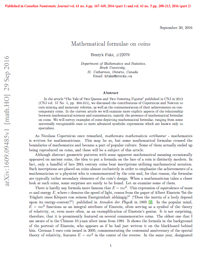Αρκετές χώρες στην Ευρώπη -κυρίως-, της Αμερικής αλλά και της Αφρικής έχουν τυπώσει πάνω στα νομίσματά τους προτραίτα επιστημόνων (φυσικών, μαθηματικών κ.λπ.) αλλά και εξισώσεων που σχετίζονται με το επιστημονικό τους έργο.