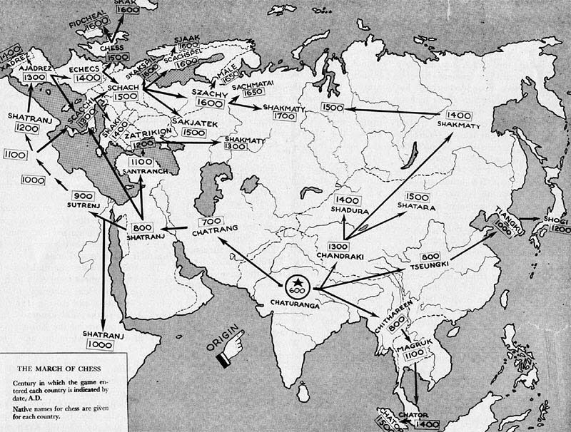 Η διαδρομή του σκακιού από την Ινδία στην Ευρώπη, μαζί με τις ονομασίες του παιχνιδιού που επικράτησαν σε κάθε περιοχή ή χώρα παρουσιάζεται πολύ όμορφα και παραστατικά κατωτέρω σε μια εικόνα που βρήκα στην Πηγή 1. Το άρθρο αυτό για τη γενική ιστορία του σκακιού είναι σύντομο, αλλά περιεκτικό και αξιόπιστο και έτσι δεν χρειάζεται να επαναλάβω όσα ιστορικά στοιχεία περιέχονται εκεί.