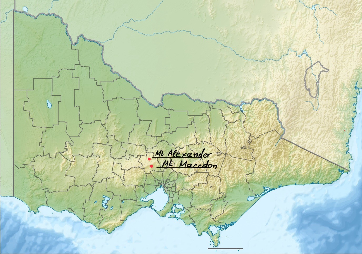 Ως προς το Mount Alexander: ο Mitchell ήταν ο πρώτος ευρωπαίος που ανέβηκε στο βουνό στις 28 Σεπτεμβρίου του 1836. Αρχικά το ονόμασε Mount Byng, από το όνομα του στρατάρχη των Αγγλικών στρατευμάτων στον Ιβηρικό Πόλεμο (Peninsular War), αλλά ύστερα το άλλαξε προς τιμή του Μεγάλου Αλεξάνδρου. Ως ανώτατος αξιωματούχος της Χαρτογραφικής Υπηρεσίας είχε άλλωστε μεγάλη διακριτική ευχέρεια ως προς τις ονοματοδοσίες.